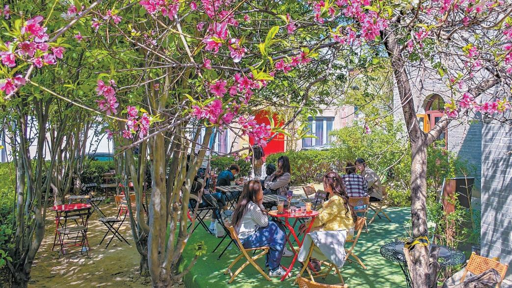 繁花伴,咖啡香。前门商圈咖啡馆“赏花+休闲”的创意深受市民喜爱。